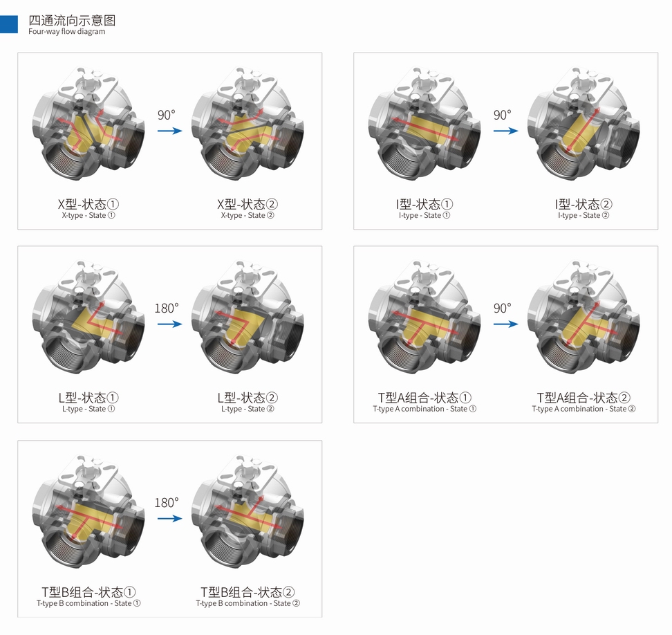 進口三通球閥結構緊湊、外型美觀、密封性能好。也能實現(xiàn)管道中介質流向的切換。也能使相互垂直的兩個通道連通或關閉。F型四閥座密封手動三通球閥造型美觀,結構緊湊合理,它不僅可實現(xiàn)介質流向的切換,也可使三個通道相互連通,同時也可關閉任一通道,使另外兩個通道連通,靈活控制管路中介質的合流或分流。